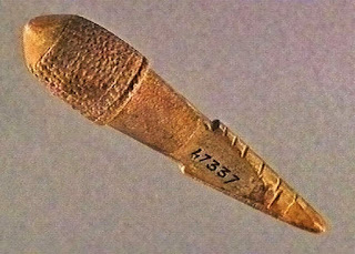 Stoppino-tappo d'avorio per un'otre d'acqua in pelle, da Fourneau du Diable, Dordogne, France: 30.000 anni fa circa. Il disegno è stato fatto dall'archeologo Denis Peyrony nel 1962 e perfeziona in qualche modo il pezzo così come doveva apparire appena lavorato. Sarebbe stato interessante avere la foto di questo elemento in diverse angolazioni.